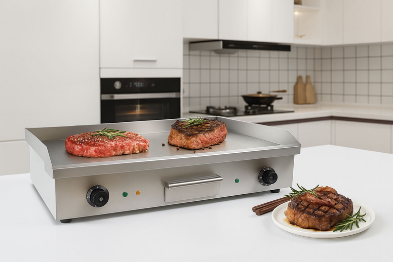 Built for power, precision, and performance, this 3KW double-control electric griddle delivers professional-level cooking right on your countertop. ⚡ Featuring a spacious 72.7×40 cm flat-top surface, it allows you to prepare multiple dishes at once — from teppanyaki and burgers to pancakes, eggs, and vegetables — all with consistent heat from 50°C to 300°C for perfect searing and even cooking. 🍳